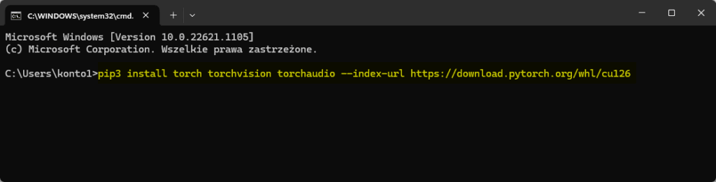 pip3 install torch torchvision torchaudio --index-url https://download.pytorch.org/whl/cu126CMDNastępnie