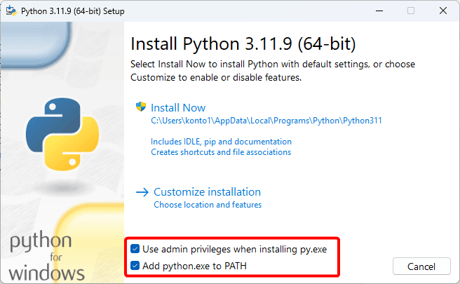 - Na pierwszym ekranie zaznacz „Add python.exe to PATH” (i jeżeli nie jest to”Use admin privileges when installing py.exe„