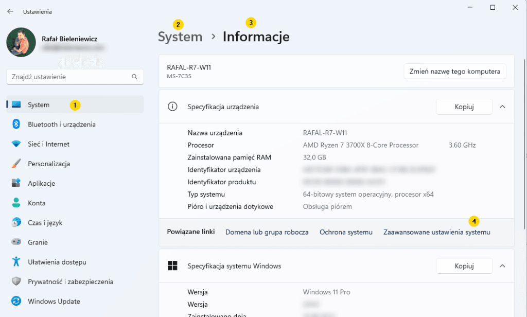 - Wejdź w Ustawienia systemu Windows. Najszybciej będzie jak klikniesz na klawiaturze WINDOWS+PAUSE
