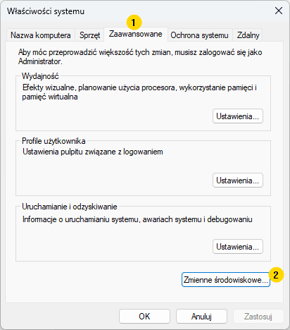- Kliknij przycisk „Zmienne środowiskowe…„