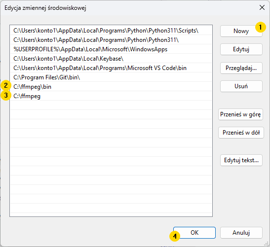 - Kliknij przycisk „Nowy” i dodaj dwie ścieżki, tam gdzie skopiowałeś wcześniej ffmpeg: